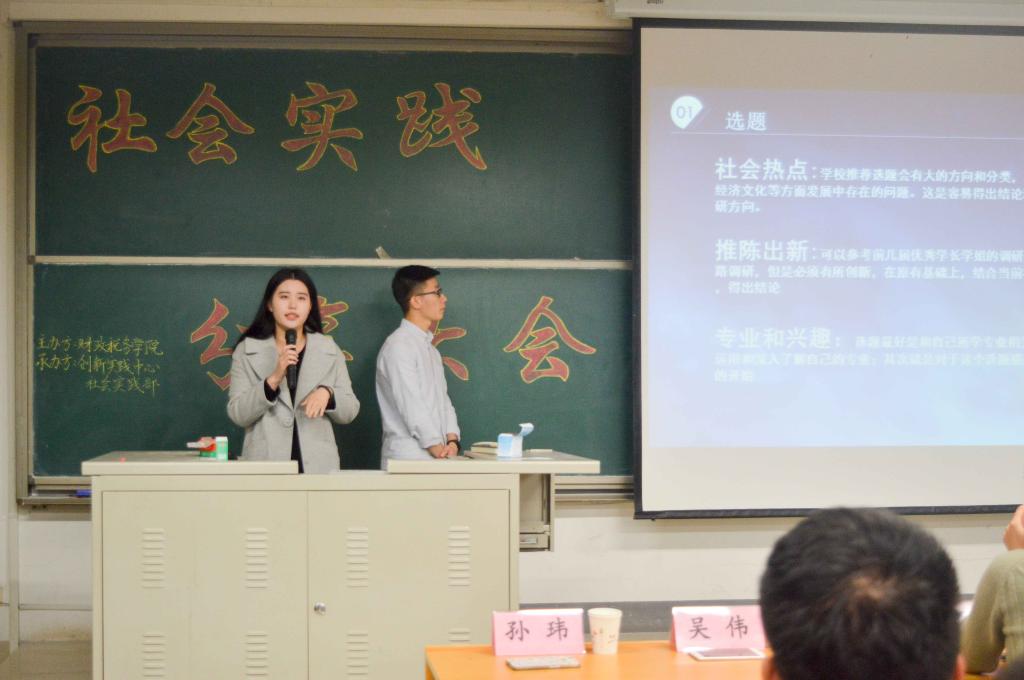 老龄服务业发展问题调研团队的队长吴伟和队员孙玮就社会实践整体过程与同学们分享经验。吴伟从队长的角度分析团队要分工协调,明确目标,感受过程,总结反思。他指出在社会实践能够体会到丰富的社会人情,并强调团队一定要根据实际做好定位,才能有效开展调研。孙玮重点讲述预立项对答辩、撰写报告等工作的重要性。